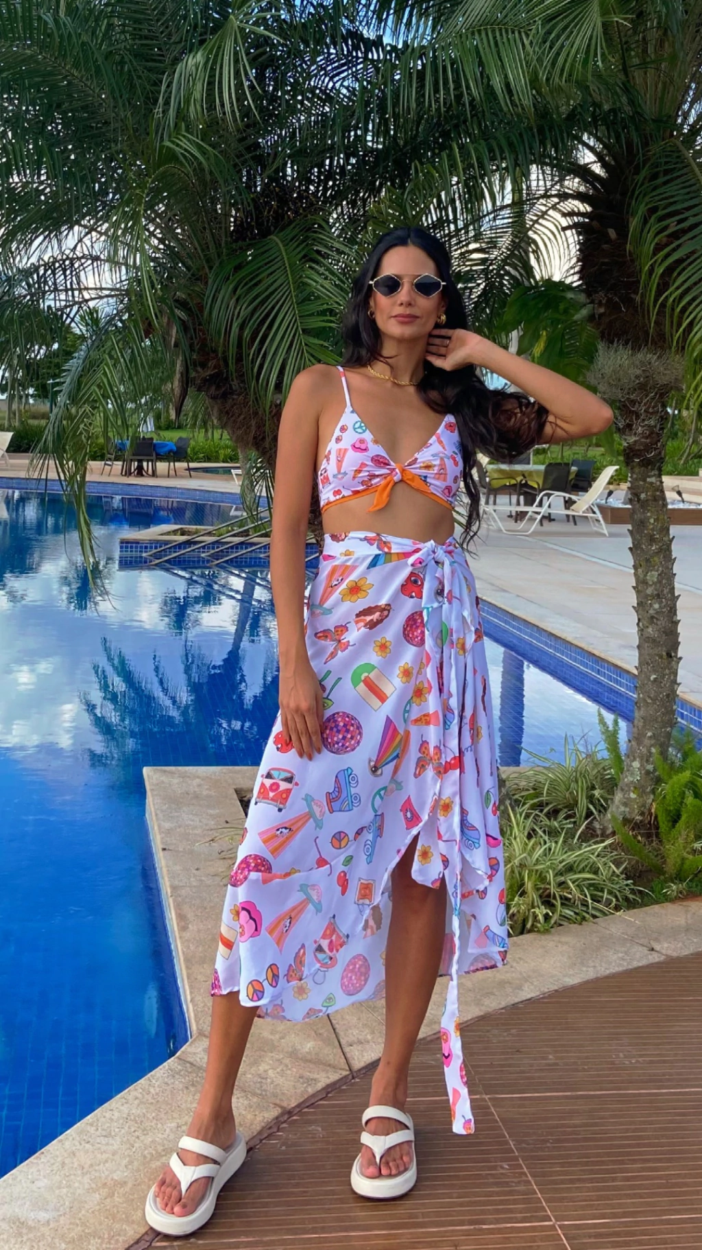 Nossa parêo é confeccionada em tecido leve. A peça possui cintura alta, cós com faixas aplicadas para amarração lateral ou transpassada, shape solto, e barra recortada em godė, commprimento de midi para longo. O mais bacana desse parêo (fora a estampa maravilhosa) é que ele pode ser amarrado de diversas maneiras! Como Saia, como tunica e até como vestidinho! Confira no nosso insta as diversas formas de amarrar o parêo.