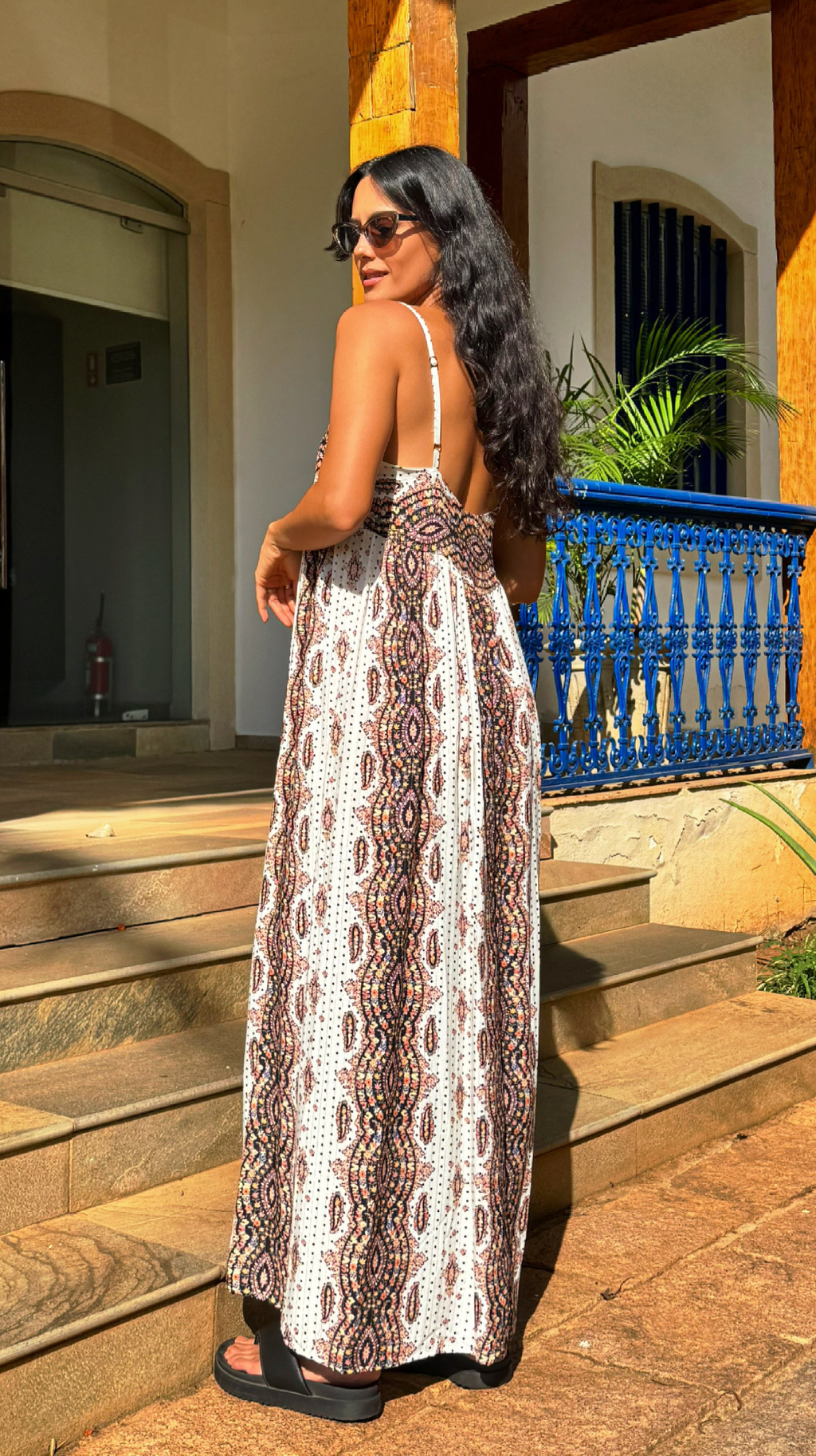 Vestido longo e fluído, com nossa estampa exclusiva: Deli. Alcinhas com regulador em metal dourado.